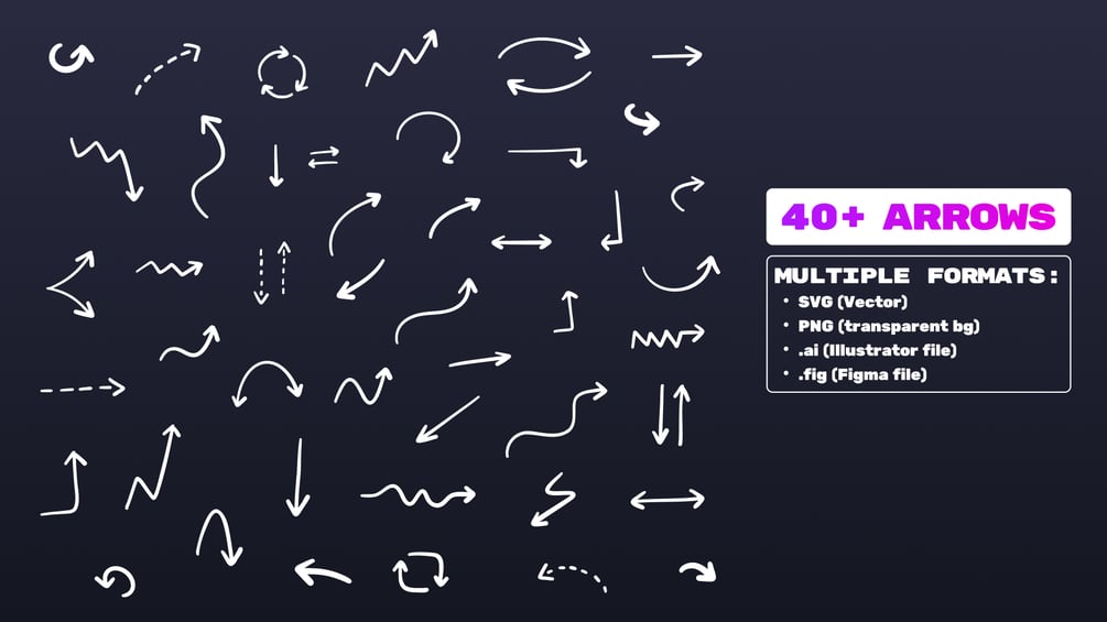 Each arrow is delivered in versatile SVG format and high-resolution PNG (transparent background), plus you get the original .ai Illustrator file and a fully editable .fig Figma file for easy customization. Perfect for annotating presentations, building websites, making icons and other creative projects.